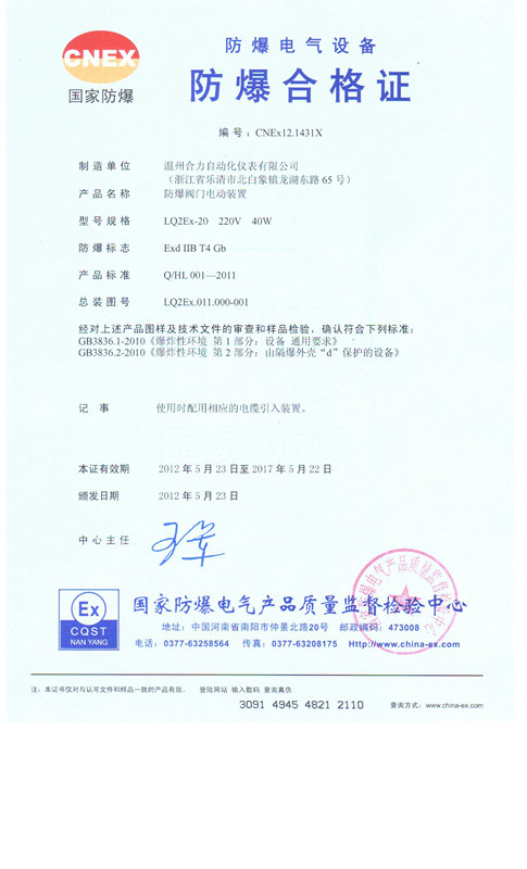 2012年5月4日,我公司向河南省國家防爆電氣產(chǎn)品質(zhì)量監(jiān)督檢驗中心提交了我公司自主研發(fā)的LQ型防爆系列產(chǎn)品的相關(guān)技術(shù)資料。經(jīng)過檢驗中心的嚴(yán)格檢驗,專家組一致認(rèn)為我公司產(chǎn)品技術(shù)先進,技術(shù)文件與防爆檢測中心的審查確認(rèn)一致,操作指導(dǎo)文件完整;5月22日,我公司系列產(chǎn)品成功通過防爆測試,并獲得國家防爆電氣產(chǎn)品質(zhì)量監(jiān)督檢驗中心證書。